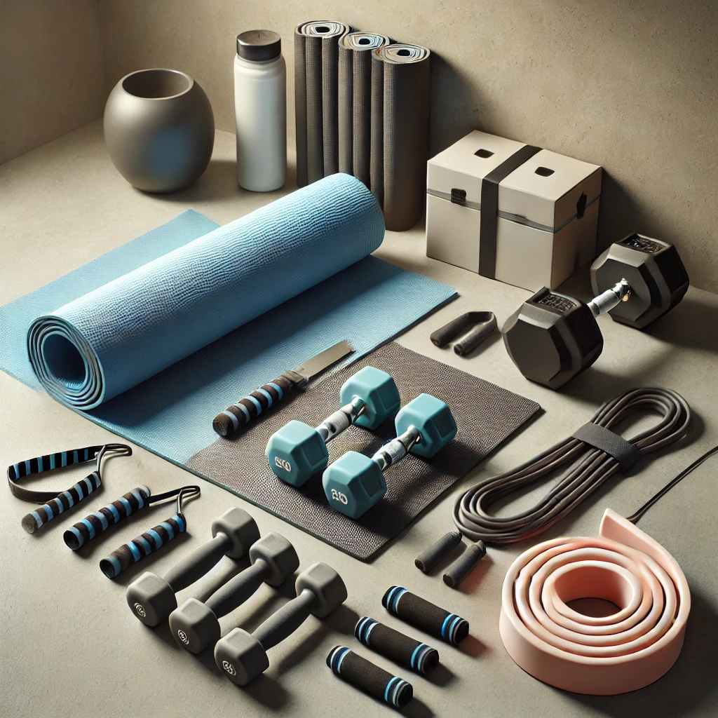 ✔ 필수 운동 용품: 요가 매트, 덤벨, 미니 밴드, 폼롤러, 줄넘기